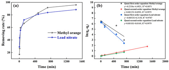 As shown in Figure 8a, the adsorption of methyl orange and lead nitrate by PPy/MMT/PP increases gradually with oscillation time and tends to stabilize. The adsorption kinetics curves for both can be roughly divided into three stages. In the first 30 min, the removal rate reaches approximately 60%. From 30 min to 720 min, the increase in removal rate slows down significantly, indicating a slower adsorption process. From 720 min to 1440 min, the change becomes negligible, and the adsorption reaches saturation. This is because the adsorption behavior involves the synergistic effect of surface adsorption and partitioning adsorption. During the initial short period, the process is primarily surface adsorption, including both physical and chemical adsorption. As the reaction progresses, surface adsorption weakens, and partitioning adsorption becomes dominant for a prolonged period.