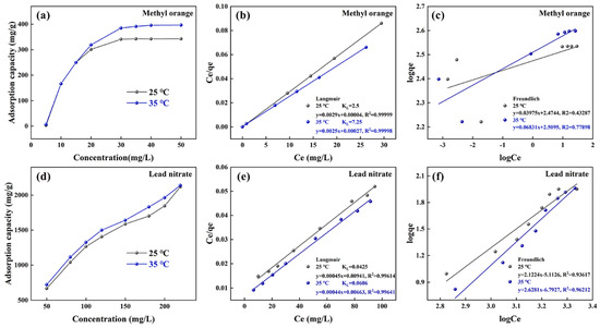 The adsorption isotherm (a), Langmuir isothermal adsorption fitting figure (b), and Freundlich isothermal adsorption fitting figure (c) of methyl orange solution; the adsorption isotherm (d), Langmuir isothermal adsorption fitting figure (e), and Freundlich isothermal adsorption fitting figure (f) of lead nitrate solution.