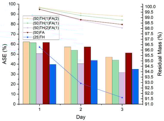 Evolution of Anti-swelling efficiency (ASE) and percentage of remaining mass (RM), where ASE is represented by columns and RM is represented by colored lines on the graph.