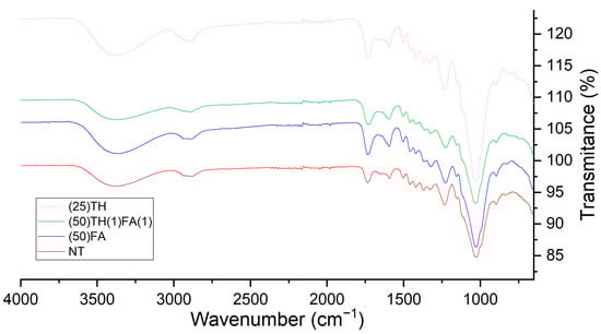 FTIR spectra comparison of samples treated only with FA, only with TH, with the combination of TH and FA and untreated sample.