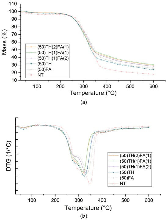 TGA curves showed an improvement in thermal stability for all treated samples characterized by a lower weight loss up to 600 °C compared to untreated wood. Tannins themselves are known to have flame-retardant properties and to be highly stable at high temperatures [32]. Moreover, polyfurfurylalcohol polymers are also known as thermostable biobased resins [33]. These characteristics may explain the higher percentage of remaining mass in the tannin and FA treatments compared to the control. Mixed treatments associating HT and FA lead to higher char contents at the end of the TGA. The (50)TH(1)FA(1) treatment had the highest percentage of remaining mass, with 30.5% of the original mass left after the process, a gain of 5 percentage points compared to the (50)FA treatment and 12.5% of untreated wood (NT). The treatment with hydrolysable tannin alone (TH) showed a similar behavior in the wood’s thermal stability comparatively to (50)FA treatment even though its weight percent gain after impregnation and curing was lower.