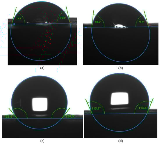 The wettability of the samples was determined using the contact angle, which was measured by the optical method using a Krüss (Hamburg, Germany) model DSA100 goniometer at room temperature and humidity. Water and diiodomethane were used as solvents, and the method of Owens–Wendt–Rabel and Kaelble model (OWRK) [28,29] was used to calculate surface free energy. The measurement began immediately after a drop of solvent touched the surface of the sample, after which 20 measurements were taken over the course of a minute. Each sample was subjected to three drops of each solvent. With the results, it was possible to estimate the surface energy.
