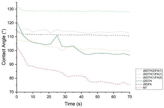 By analyzing the contact angle of each treatment over the course of 70 s, we can see that the untreated wood and the (25)TH treatment show a clear decrease in contact angle, starting at 103° and 120°, respectively, and ending at 75° and 96°. On the other hand, contact angles recorded on wood treated with FA are stable over the 70 s time course.