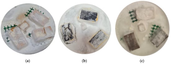 After 12 weeks, the samples were removed from the medium and gently cleaned with a brush to remove mycelium, and then dried in an oven for 48 h at 103 ± 2 °C. The following equation (Equation (7)) calculates the degradation after 12 weeks (WLD) of each sample: