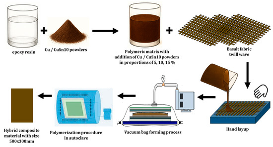 Composite samples consisted of five layers of basalt fiber fabric, measuring 500 mm × 300 mm and having a weight fiber fraction (wf) of 50%, CuSn10 powder at concentrations of 5%, 10%, and 15%, and epoxy resin. Table 1 presents the composition of the laminated composites samples.