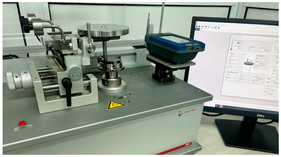 Tribological research was conducted using TRB3 tribometer (Anton Paar GmbH, Graz, Austria) depicted in Figure 4. TRB3 complies with ASTM G99 [31], ASTM G133 [32], and DIN 50324 [33] standards, ensuring that tribological tests are conducted according to best industrial practices. Regular calibration of the tribometer was performed to maintain the accuracy and reliability of the measurement data. The software of the tribometer allows for setting parameters to meet all testing needs (different modes of speed, loading, movement, etc.). Additionally, the software includes a “Modelization” module by default, which allows for simulation of contact stress and deformation distribution.