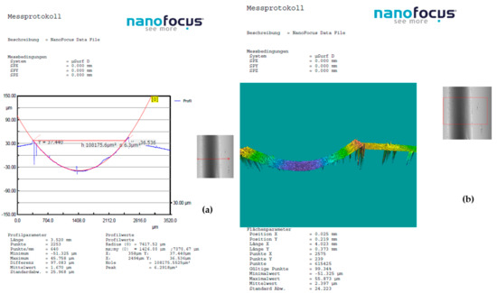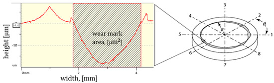 The most effective approach consists of conducting a comprehensive assessment of the wear track surface. In pin-on-disk testing configurations, the number of profilometric scans is a key factor in accurately characterizing the wear track, with a greater number of scans required in cases where the wear pattern is non-uniform [19,20,21,22,23].