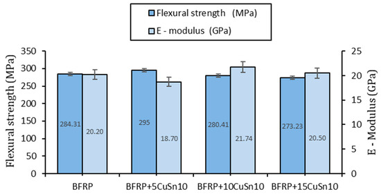 Variation of flexural strength and elastic modulus for BFRP_CuSn10 sample.