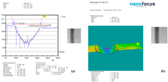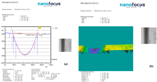 Dry friction test of BFRP + 10% CuSn10 sample, performed at 10 N load, 0.25 m/s sliding speed, and a duration of 120 min, in contact with a chromium–alloy steel ball: (a) Wear surface profile curve; (b) 3D worn surface morphology of the disk.