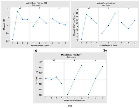 The main effects plot for temperature (T) indicated that the minimum mean values were achieved at 15% wf (level 4), 10 N applied force (level 1), and a sliding speed of 0.1 m/s (level 1), as shown in Figure 12c.