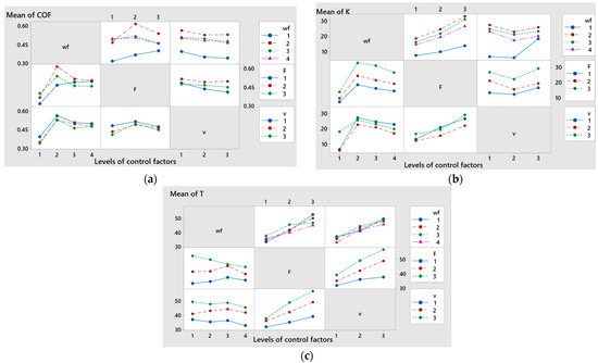 Interaction effects plot for (a) coefficient of friction; (b) specific wear rate; (c) temperature.
