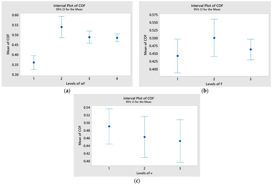 The effect of each factor on the coefficient of friction (COF), along with standard error intervals, is visualized in Figure 14. A significant difference in the mean COF values for the weight fraction (wf) was observed, as the interval bar for level 1 (wf = 0%) did not overlap with those for levels 2–4 (Figure 14c). In contrast, the differences in mean COF values for applied force (F) and sliding speed (v) were likely not significant, as the standard error bars overlapped across all levels (Figure 14a,b).