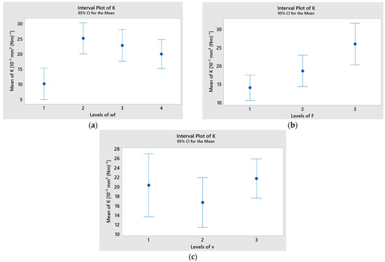 Interval plot of specific wear rate (K) factor of basalt fiber-reinforced hybrid composites with (a) wf; (b) F; (c) v. Individual standard deviations were used to calculate the interval plot. Bars are standard errors of the mean.