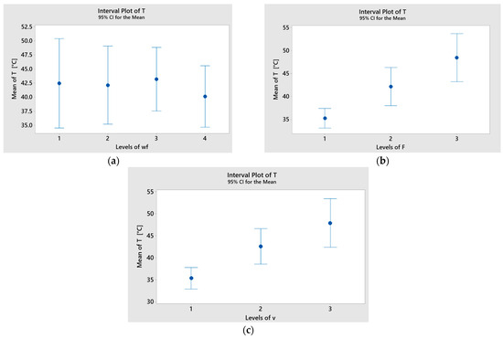 Figure 16 presents the interval plots for temperature across each factor, with the lowest mean values recorded at wf = 15%, F = 10 N, and v = 0.1 m/s. Significant differences between the mean temperature values for applied force (F) and sliding speed (v) were observed, as the corresponding interval bars did not overlap.