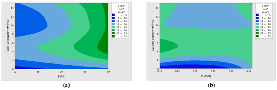 Contour plot prediction of specific wear rate (K) with (a) CuSn10 powder wf and F; (b) CuSn10 powder wf and v.