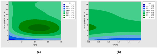 Contour plot prediction of coefficient of friction (COF) with (a) CuSn10 powder wf and F; (b) CuSn10 powder wf and v.