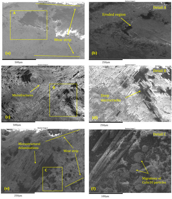 SEM micrographs of wear tracks on BFRP composites with CuSn10 content of (a,b) 5%, (c,d) 10%, and (e,f) 15%, following 120 min of dry sliding against a 52100 steel ball at 10 N load and 0.25 m/s sliding speed.