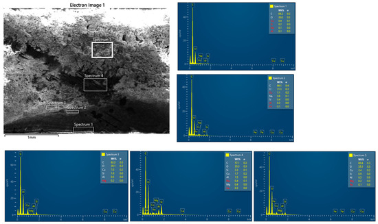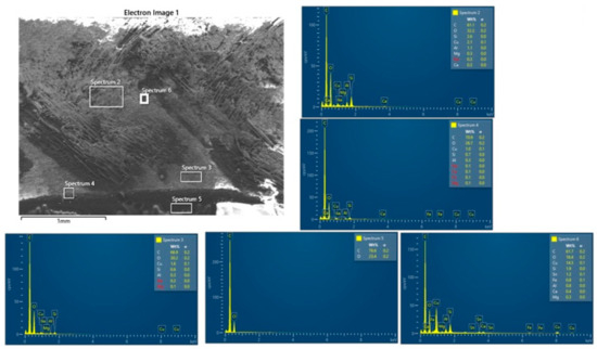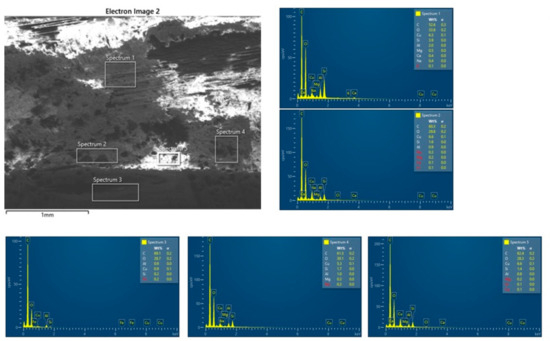 The EDS spectroscopy performed on the BFRP_CuSn10 samples at different concentrations (5%, 10%, and 15%), presented in Figure 20, Figure 21 and Figure 22, and confirms the presence of Cu and Sn elements, demonstrating the distribution of bronze in the composite structure. Although EDS mapping was not performed, the point and area spectra were collected directly from worn regions where tribolayer formation was observed, providing localized evidence of Cu, Sn, and O presence associated with oxide-based tribofilms. An important aspect observed in the chemical analysis is the presence of a significant oxygen content, which suggests the formation of metal oxides during the friction process. These oxides may aid in forming a protective layer on the composite surface, which positively influences the material’s tribological performance. Traces of Fe and Cr were also identified, indicating a possible material transfer from the 52100 steel ball used in the testing.