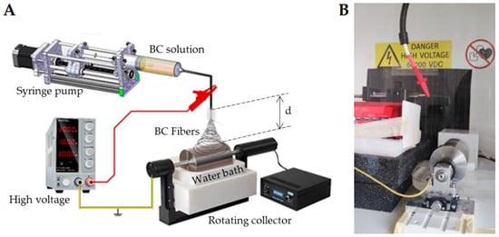 (A) Schematic of the electrospinning apparatus used to spin BC solutions, with d = distance from the needle tip to the collector surface. (B) Photograph of the spinning part of the used apparatus.