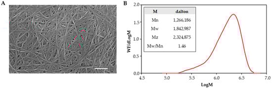 During the stationary cultivation of Komagataeibacter xylinus, BC was formed as a film on the surface of the nutrient medium. Figure 2A displays the SEM morphology of BC as produced, showing the presence of tightly arranged fibers with variable size, most of them in the tens-of-nanometer range. Figure 2B depicts the molecular weight distribution of the obtained BC, which is further detailed in the inset table according to number-average (Mn), weight-average (Mw), and z-average (Mz) molecular weights of BC, determined by SEC analysis.