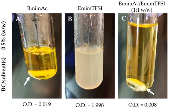 Dissolution of BC in different solvent systems at 0.5% w/v concentration and respective optical densities (O.D.): (A) BmimAc, (B) EmimTFSI and (C) BmimAc/EmimTSFI (1:1 w/w). Arrows indicate a magnet, left inside to show transparency.