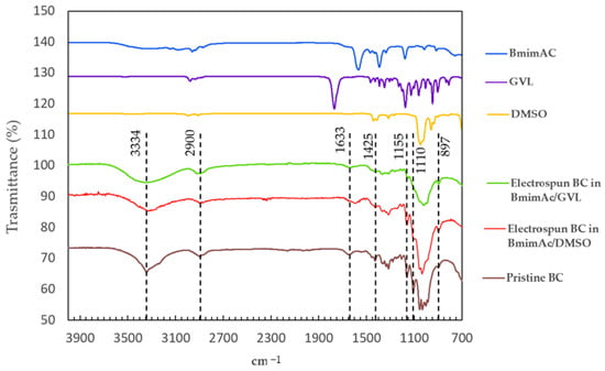 FTIR spectra of electrospun BC fibers obtained from BmimAc solutions added with either GVL or DMSO as co-solvents, compared with pristine BC, solvent (BmimAC) and co-solvents alone.