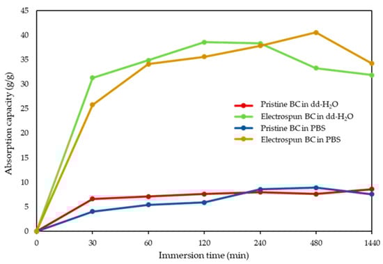 The electrospun BC meshes demonstrated higher absorption capacity both in dd-H2O and in PBS with respect to pristine BC, as shown in Figure 6.