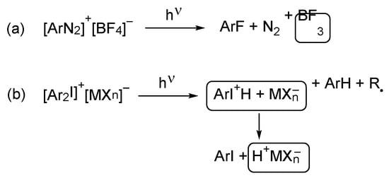 - Klikovits, N.; Knoock, P.; Bomze, D.; Krossing, I.; Liska, R. Novel photoacid generators for cationic photopolymerization. Polym. Chem. 2017, 8, 4414–4421. [Google Scholar] [CrossRef]