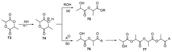 - Basko, M.; Kubisa, P. Mechanism of propagation in the cationic polymerization of l,l-lactide. J. Polym. Sci. Part A Polym. Chem. 2008, 46, 7919–7923. [Google Scholar] [CrossRef]