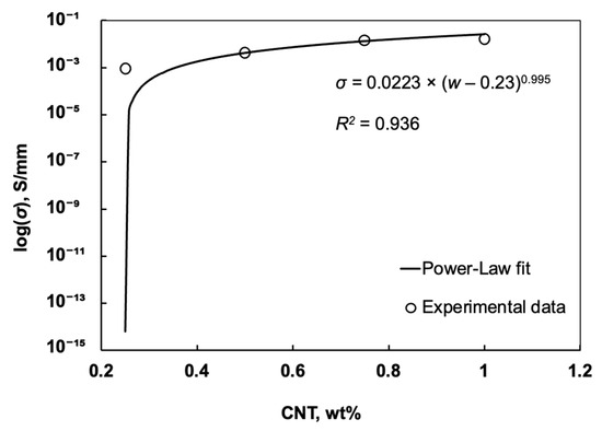 Figure 5 illustrates the relationship between CNT weight fraction and electrical conductivity in the epoxy composite after CNT alignment was performed. The data points represent measured conductivity values for each CNT content, while the curve shows the fitted power-law model, which describes the behaviour of electrical conductivity as the CNT content approaches the percolation threshold. The conductivity σ of CNT-enhanced composites follows the percolation model, as expressed in the following equation [36,37]: