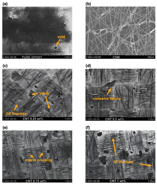 At 0.25 wt% and 0.5 wt% CNT (Figure 8c,d), the fracture surfaces exhibit well-defined glass fibre imprints, suggesting strong adhesion between the adhesive and the composite substrate. The fracture morphology is indicative of cohesive failure, with relatively smooth fracture planes and small voids, confirming effective load transfer and uniform stress distribution. As CNT content increases beyond 0.5 wt% (Figure 8e,f), notable changes in the fracture morphology emerge. At 0.75 wt% and 1 wt% CNT, the SEM images reveal irregular fracture surfaces, an increase in void size, and signs of localised detachment, indicating a loss of bond uniformity. This suggests that excessive CNT content may lead to agglomeration, disrupting the adhesive matrix continuity and creating stress concentration points. These effects are further corroborated by the presence of larger voids and extensive matrix cracking, which could have contributed to the reduction in shear strength observed in mechanical testing.