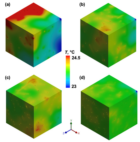 Beyond the alignment effect, cluster position factors also influence the observed temperature distributions in aligned CNT networks. Variations in heating surface exposure and proximity to the outer boundaries affect heat dissipation, contributing to localised temperature differences. A larger effective heating area allows more uniform energy transfer, yet it also results in higher peak temperatures in some cases, e.g., edge proximity effect (Figure 11a—cluster is in the centre of RVE, Figure 11c,d—clusters are closer to the outer boundary of the model). Additionally, when the heating region is closer to the outer edge of the volume, heat dissipation is reduced, further amplifying local temperature variations compared to the randomly distributed CNT configurations.