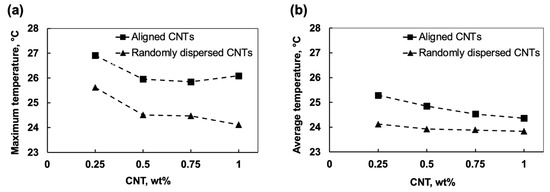 As shown in Figure 12b, the average temperature followed the same pattern, where the 0.25 wt% aligned model had the highest value of 25.29 °C, compared to 24.12 °C in the random configuration. Meanwhile, for the 1 wt% CNT model, the aligned and random distributions exhibited average temperatures of 24.36 °C and 23.83 °C, respectively.