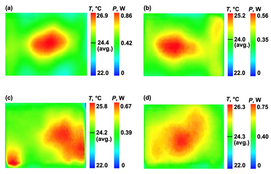 Temperature and power distribution during curing for aligned CNT specimens at: (a) 0.25 wt%, (b) 0.5 wt%, (c) 0.75 wt%, (d) 1 wt% loading (heating area 25 × 12.5 mm).