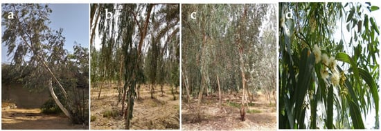 The trees were selected from three sites in the western region of Saudi Arabia. The first site chosen was King Abdullaziz University (KAU) campus (Figure 1a). The second site investigated was the Agricultural Research Station (ARS) that belongs to the KAU at Hada Al-Sham village (Figure 1b,c) in Al-Jomoom Governate, about 120 km away from Jeddah (at a latitude of 21° 46′.839 N and a longitude of 39° 39′.911 E above the sea level by 206 m). Furthermore, the recreation forest at Briman district (Figure 1d) was the third place considered. In addition, Eucalyptus globulus Labill trees were chosen from those grown at the ARS.