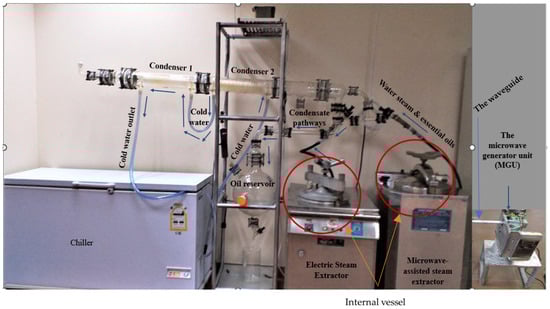 The microwave-assisted steam distillation (MASD) was designed to rely on a microwave generating unit that emits microwave beams to achieve the desired temperature of the extraction process, as shown in Figure 2, Figure A3, and Figure S1. The installation of MASD was carried out, followed by omitting the electric heater, and the autoclave was allowed to be heated by a microwave beam directed towards using an ideal waveguide. Concerning electric steam distillation (ESD) apparatus, the ESD (Figure 2) was also used for distilling the essential oil from Eucalyptus’ leaves. It uses an indirect electric current heater for this function.