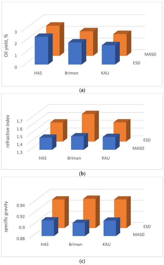 The MASD has several key points regarding the novelty and advantages of microwave oil extraction such as improving efficiency, reducing the extraction period, as well as solvent usage, energy savings, enhancing the quality of extracts, scalability, simplicity and process integration, modifiability, and innovation in byproduct utilization [26,27,28,29,30,31,32,33,34,35,36,37]. Furthermore, it has other benefits such as its accessibility, sustainability, cost-effectiveness, and labor-intensiveness; it also shortens the extraction time, enhances selectivity, increases essential oil yields, is environmentally friendly, and does not harm the quality or chemical composition of the oils [22,23].