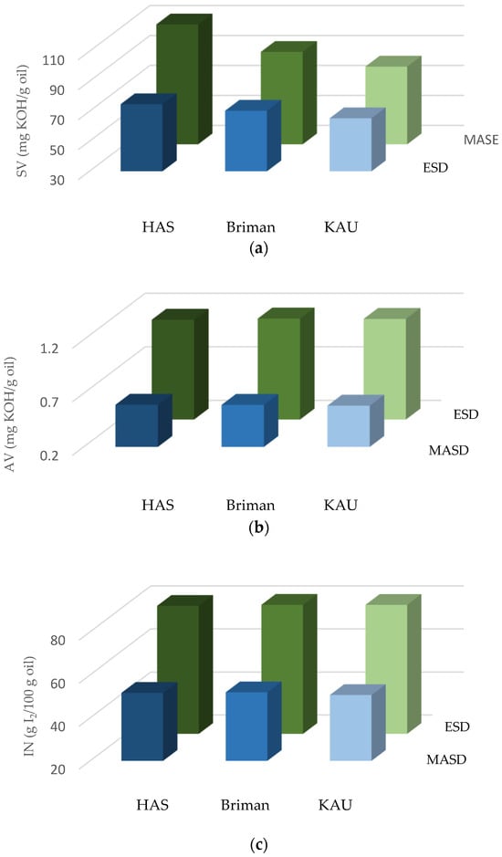In addition, the ASTM standard methods were applied for specific gravity (SG), saponification value (SV), the acid value (AV), and iodine number (IN) according to ASTMs [70,71,72,73,74].