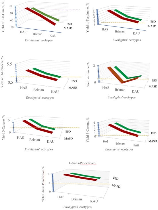 Essential oil extraction is a complex process involving classical and innovative techniques. Classical methods like hydro-distillation and steam distillation rely on heat and water while green methods like ultrasound-assisted and microwave-assisted extraction use energy-efficient sources. Supercritical fluid and subcritical liquid extraction allow non-polar components to be extracted. Hydro-distillation is the most commonly used method due to its accessibility and cost-effectiveness. Eucalyptus’ essential oil extraction involves crushing, drying, and distillation. Traditional methods like maceration, oil infusion, and steam distillation are labor-intensive and expensive. Microwave-assisted steam distillation (MASD) is a fast and efficient alternative to traditional methods, combining steam distillation with microwave heating, reducing extraction time, enhancing selectivity, and increasing essential oil yields. It has gained attention as an efficient and environmentally friendly alternative for extracting essential oils from botanical sources. In a microwave reactor, electromagnetic energy is transformed into heat, causing the sample to rupture and release essential oil [21,22,23,24,25].