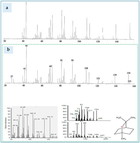 Mass spectra were compared with those from the National Institute of Standards and Technology (NIST), USA, and retention indices were compared with data from the scientific literature to determine the composition of the sample [67,68]. The peak area normalization technique was used to calculate the yields of the chemical components present in the volatile oils [66,67,68,69,77].