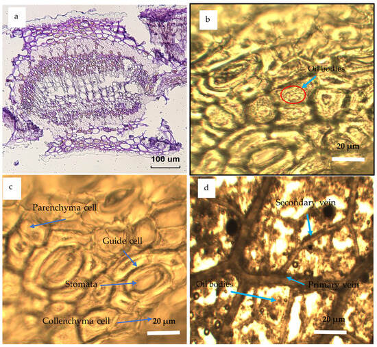 The preparation of anatomical samples for microscopy involved three processes: prefiltration, infiltration, and polymerization as indicated by Merela et al. [78] with some self-modifications. The samples were dehydrated in 70% ethanol, then in a 1:1 propylene oxide-resin blend for 30–40 min, and finally embedded into a pure resin block. Concerning sectioning and slide preparation, Lecia HistoCore Nanocut microtome (Leica Biosystems Deer Park, IL, USA), was used to make an ultrafine section (~10 µm) of a leaf tissue using a diamond cutting knife with an angle of 3–8°. Then, slices were collected and stained using toluidine blue. Once a golden ring appeared on the outside of pigment droplet, the staining was completed. The optical speculation system consisted of a light microscope (CE–MC200A) with suitable vision system (OPTIKA PRO 5 Digital Camera–4083.12) using a Vision PRO 4 software.