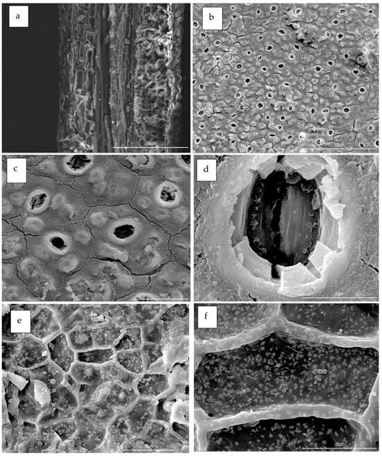 A compact portion of a leaf, about 3 mm in length, was isolated, air-dried before embedding and fixation, attached to a double-sided carbon tape, and sputtered by gold to enhance its electric conductivity. Subsequently, the sample to be examined by the SEM was placed on an aluminum stub analysis. A Quanta FEG 450 scanning electron microscope (SEM) type, produced by FEI, based in Amsterdam, Netherlands, was used to examine the materials. The accelerating voltage used to test the microscope ranged from 5 to 20 kV.