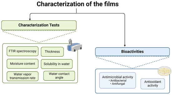 All films, with and without EOs, were characterized according to the scheme outlined in Figure 1. The film without EO served as the control in all characterization tests and will be referred to as “Control” from this point forward.