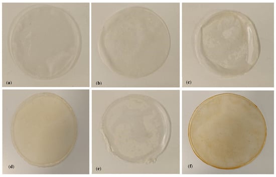 Photographs of the alginate films. (a) Alginate film without EO; (b) alginate film with rosemary EO; (c) alginate film with eucalyptus EO; (d) alginate film with oregano EO; (e) alginate film with sage EO; (f) alginate film with thyme EO.