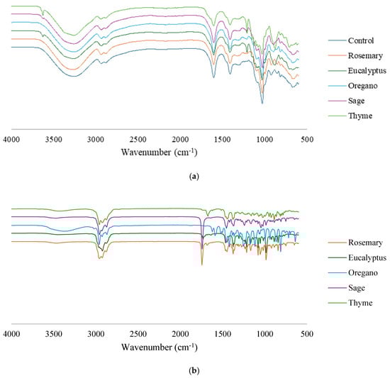 The infrared spectra of the control film and the films incorporated with EOs (Figure 3) were used to investigate the intermolecular interactions between the films’ components and assess whether the addition of an EO to the film altered its structure. Additionally, the FTIR spectra of the pure EOs (Figure 3b) were examined to help identify specific functional groups responsible for any spectral changes observed in the films, thereby providing further insight into the interactions between the oils and the film structure.