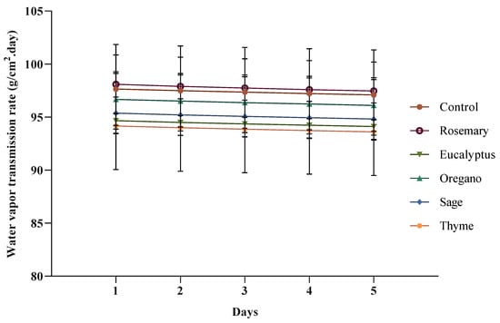 The incorporation of thyme EO into an alginate film significantly decreased the water vapor permeability rate (p < 0.05). On the other hand, the film incorporated with rosemary EO presented a higher water vapor permeability rate when compared to the control film, and the films with eucalyptus, oregano, and sage showed lower water vapor permeability rates; however, these differences were not significant (p > 0.05). The water vapor permeability rate for all films was practically constant and did not change much over time.