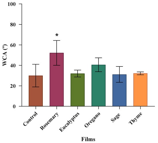 The control film exhibited a lower WCA value. When rosemary EO was added to a film, the WCA increased significantly (p < 0.05) (Figure 5) compared to the control film. The incorporation of the other oils also increased the WCA value, but it was not significant (p > 0.05). A similar result was observed by Siracusa et al. [34] for alginate/pectin films with citral, and by Sharma et al. [37] for poly(butylene adipate-co-terephthalate)/poly(lactide) films incorporated with clove and thyme EOs. Jafari et al. [29] produced alginate/gelatin films with anise EO and obtained the same result. This author also concluded that an increase in the concentration of EO in a film increases the WCA. Therefore, adding an EO to a film, with its hydrophobic nature, raises the WCA value of a film, making it more hydrophobic [29,34,37].