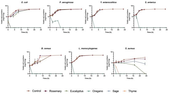The film incorporated with oregano EO was the only one that could completely inhibit the growth of all studied bacteria. In fact, this film inhibited the growth of E. coli, Y. enterocolitica, S. aureus, B. cereus, and L. monocytogenes after two hours of contact. Still, it took four hours to completely inhibit S. enterica and eight hours to eradicate P. aeruginosa. The film with thyme EO inhibited E. coli (2 h) and S. aureus (4 h). The film with eucalyptus EO could only inhibit S. aureus after 24 h, and the film with sage EO eradicated B. cereus after two hours. The film incorporated with rosemary EO did not inhibit the growth of any of the bacteria under study (Figure 6).