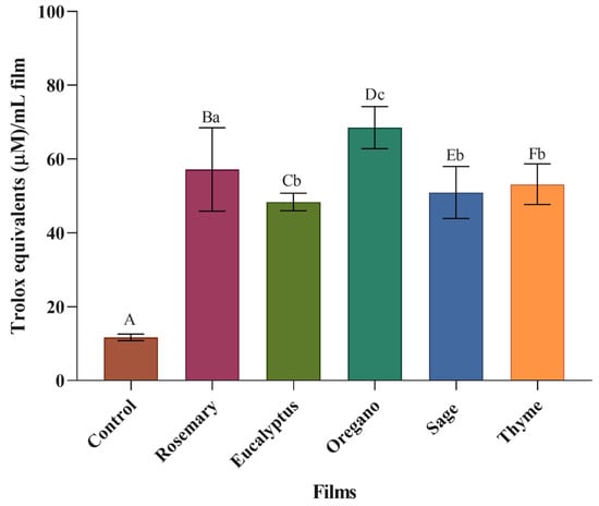 Antioxidant activity of the control film and the films incorporated with the different EOs. Upper-case letters mean significant differences (p < 0.05) between the films with EOs and the control film, and lower-case letters mean significant differences (p < 0.05) between the films with different EOs.