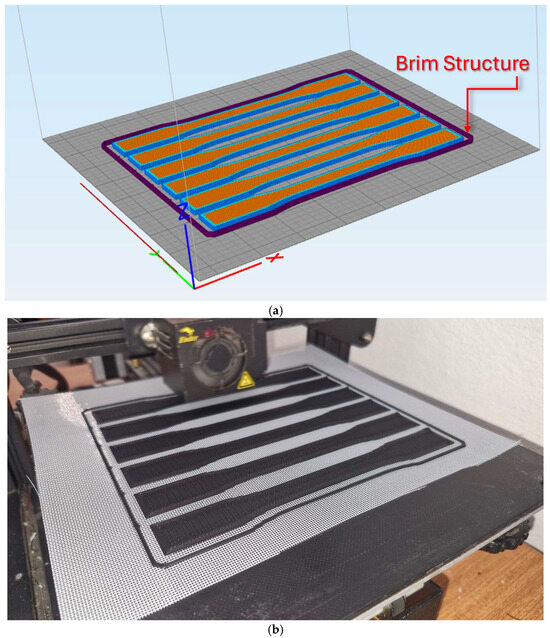 (a) Slicer output showing the brim structure. (b) Tensile test samples during manufacturing.